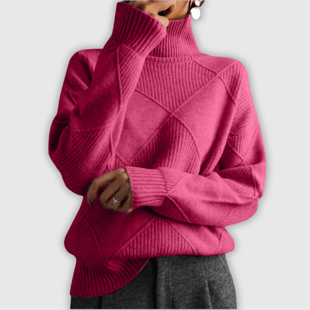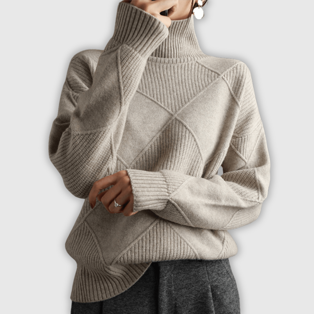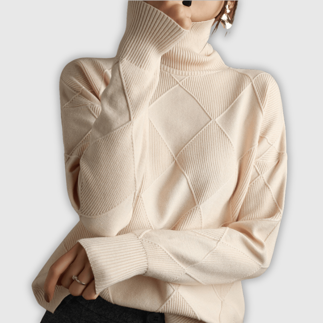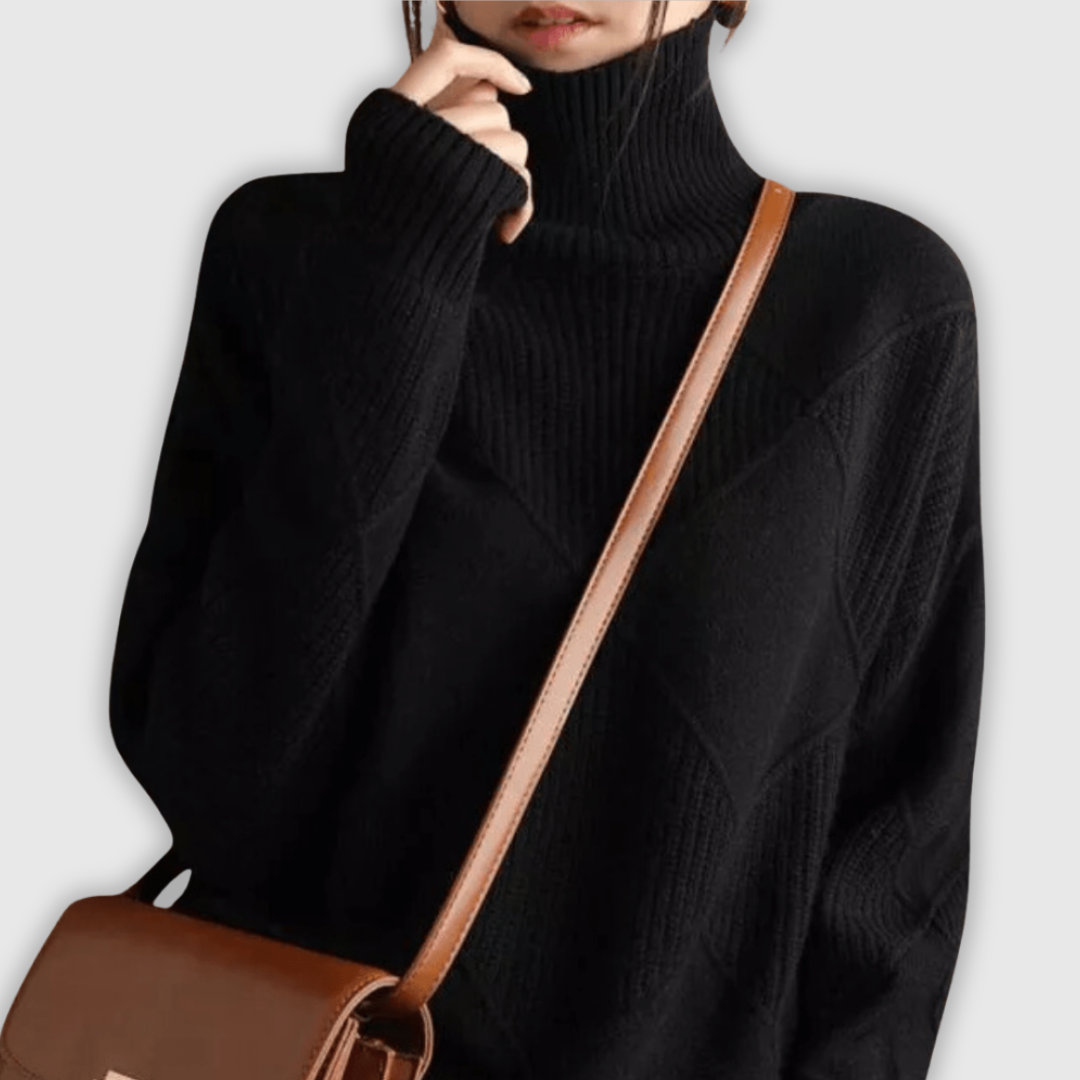• 上品なタートルネック — 首元を美しく見せながら暖かさもキープ。